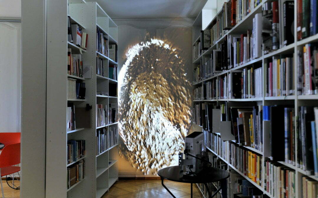 Mittels einer Videoinstallation wird eine goldene Schwelle abgebildet. Diese wird vom Besucher beeinflusst und belebt. Grössere Gebilde verschmelzen mit menschlichen Präsenzen und verbinden das Jetzt mit dem Eben noch. In dieser dauernden Bewegung ertönt das Echo unserer Schritte in einem weiten Universum, welches unsere Körper in ihren Grenzen beinhalten.